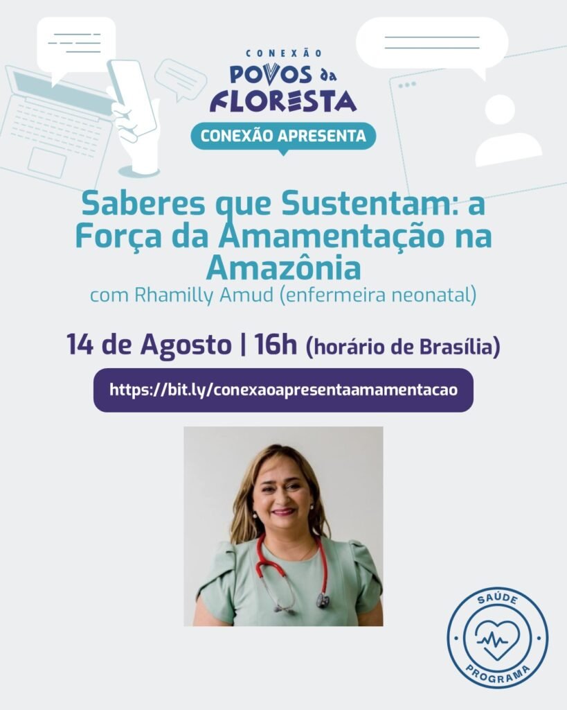 Agosto é o mês da amamentação, e a Rede Conexão Povos da Floresta realiza mais uma edição do Conexão Apresenta, em parceria com a SAMA – Health in Harmony. O encontro, intitulado Saberes que Sustentam: a Força da Amamentação na Amazônia, será um espaço de diálogo e cuidado em torno do aleitamento materno nas comunidades amazônicas.